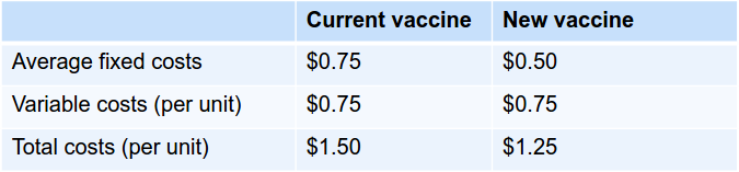 - Costs: understand the additional fixed and variable costs that go into manufacturing the vaccine with the new formula