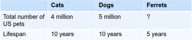 Cats and dogs are extremely popular in the United States, so it’s safe to assume that the ferret market is substantially smaller. Interviewee should make a reasonable assumption about the number of domesticated ferrets in the US. For ease of calculations, let’s assume there are 1 million domesticated ferrets in the US.