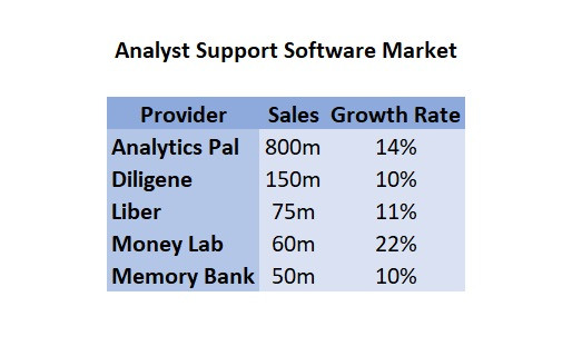 The markets for administrative and analyst support software are each dominated by a few major players. FinCode is currently the largest player in the administrative software market with the top five players accounting for almost 75% of the market. Similarly, the top five players control around 75% of the analyst-support market