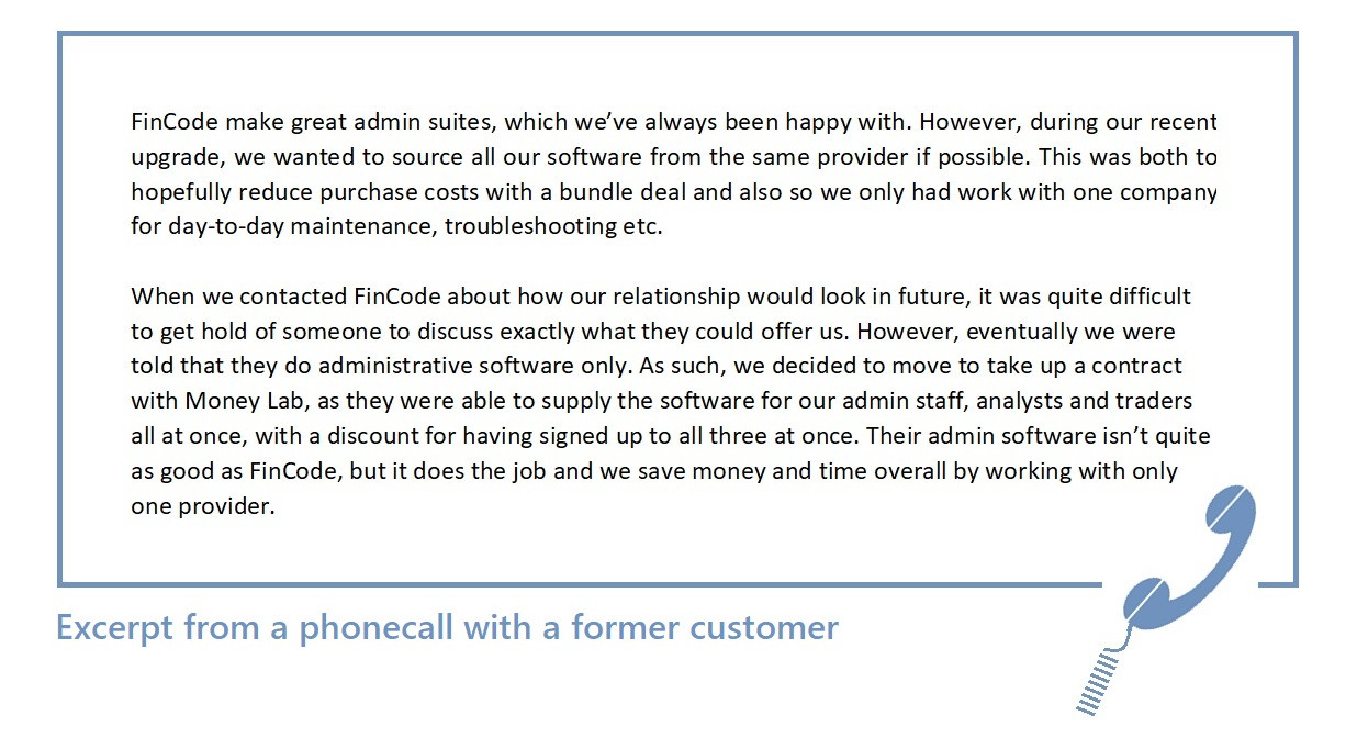 Of course, Vault/FinCode cannot ask other companies this question directly. However, we can ask firms in the market for such software who are not their customers. Most useful will be firms which were using FinCode until recently, but have switched to other providers.