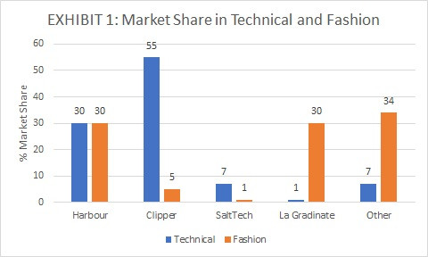 From Exhibit 1, Harbour has a 35% share of the technical and a 30% share of the fashion market.