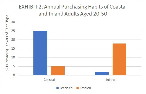 We can get an idea of how much technical and fashion jackets cost by comparing the average prices paid by coastal vs inland buyers in Exhibit 3.