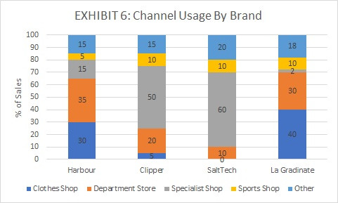 Exhibit 6 shows that these retailers are where a large fraction of Clipper's and SaltTech's jackets are purchased, but Harbour does not sell many of its jackets via this channel.