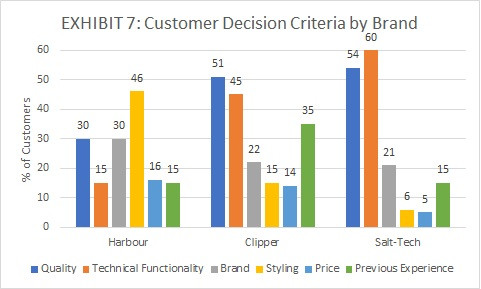 Style is the top decision criterion for Harbour. From our data on Clipper and SaltTech, we can see that this is not a primary consideration for coastal/technical customers. Emphasis on the fashion market might allow Harbour to focus on excelling where their strengths already lie.