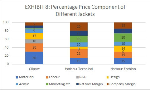 If we compare the costs of Harbour to Clipper in Exhibit 8, we see that the most notable differences are Clipper's much higher spend on materials Design and R&D. This bolsters customer perception of their jacket's better technical functionality and higher quality.