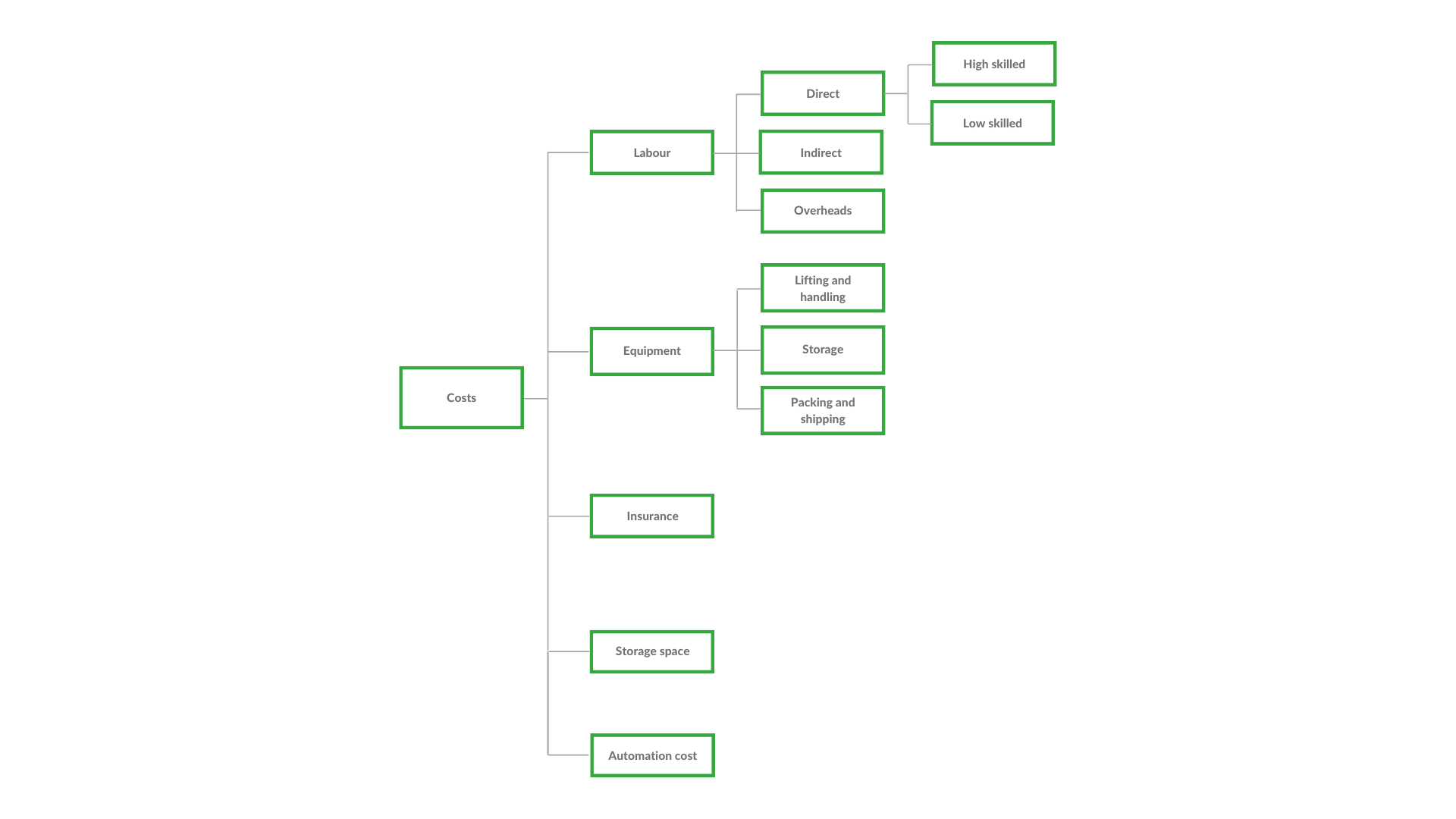 They should be able to list labour, equipment, insurance and storage space as the key drivers of costs. You should then guide the candidate to elaborate on labour and equipment. They should be able to segment labour across direct, and indirect workers and overheads. This segmentation is not strictly necessary but they should be able to identify low-skilled and high-skilled labour as two separate segments of the workforce.