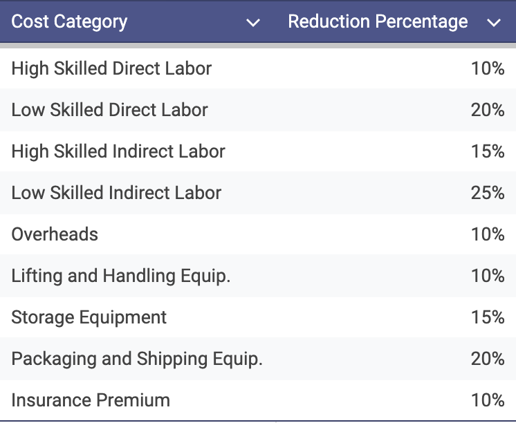 Low Skilled Indirect Labor: 25% reduction