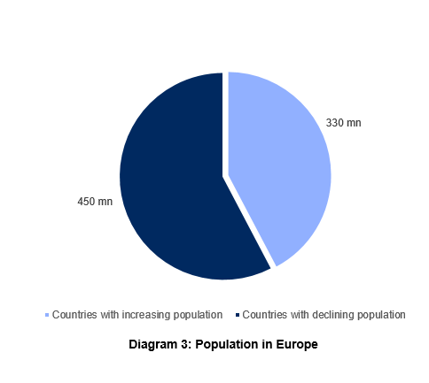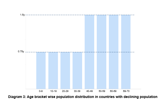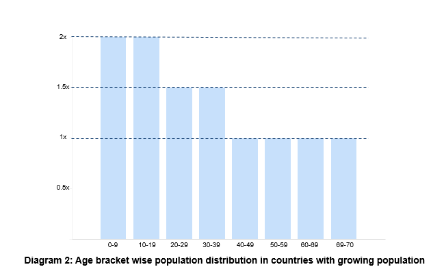 For countries with growing populationPopulation between 0-19 years (20 year time span) = 2 * x + 2 * xPopulation between 0-19 years (20 year time span) = 4 * 30 = 120 mPopulation between 2-16 years (15 year time span) = 120 m/ 20 * 15Population between 2-16 years (15 year time span) = 90 mFor countries with declining populationPopulation between 0-19 years (20 year time span) = 0.75 * y + 0.75 * yPopulation between 0-19 years (20 year time span) = 1.5 * 50 = 75 mPopulation between 2-16 years (15 year time span) = 75 m/ 20 * 15Population between 2-16 years (15 year time span) = 56.25 mTotal population between 2-16 years = 90 m + 56.25 m