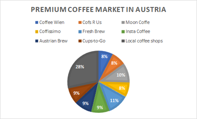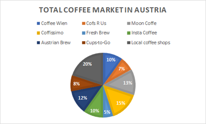 We see that the market is fragmented, with eight major players as well as local coffee shops controlling 20% of the coffee sales.