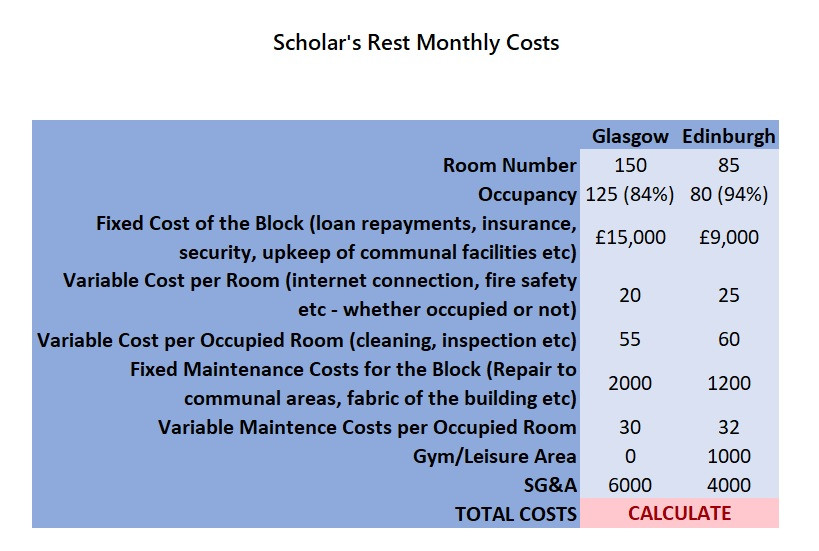 Scholar’s Rest had worried about the profitability of their Edinburgh accommodation block. However, analysis has shown that there is no problem with the profitability for that element of the business, with the Edinburgh accommodation actually yielding a higher margin.