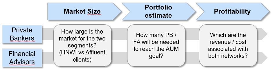 - Affluent segment is a larger market compared to HNWI -> the bank would need around half the market share on Affluent to reach the AUM goal